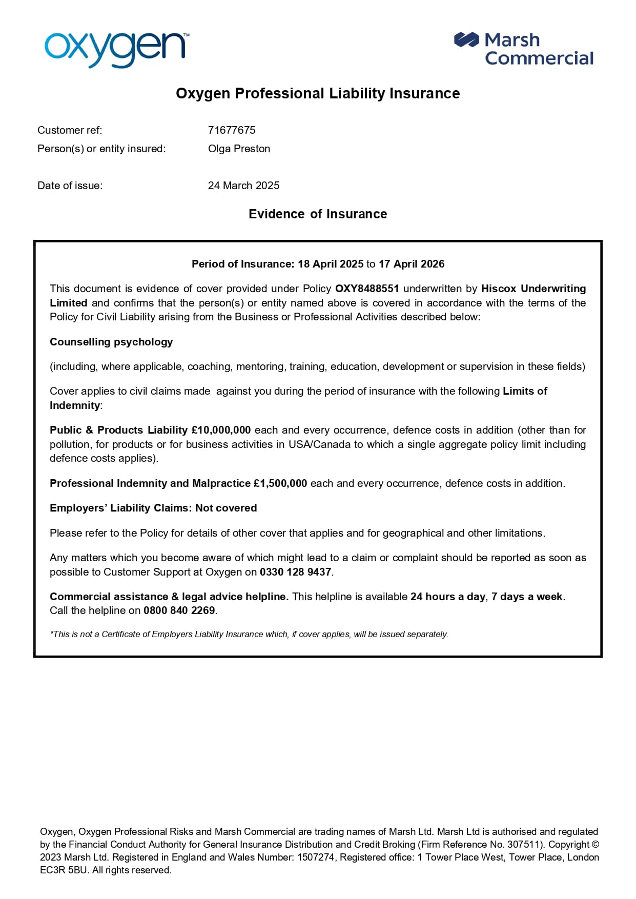 Dr Olga Preston is a Chartered Psychologist with an exceptional breadth of academic and clinical training that spans multiple areas within mental health. Her robust academic background reflects her unwavering commitment to professional development and lifelong learning. In addition to a Doctorate in Counselling Psychology, she holds an MSc in Clinical Psychiatry, an MSc in Forensic Mental Health, and a Postgraduate Diploma in Clinical Sexology. Further strengthening her capacity to work with complex psychological presentations, she has completed a Certificate in Traumatic Stress Studies. Currently, Dr Olga is further deepening her knowledge by pursuing an MSc in Pain Management, underscoring her dedication to advancing both her clinical understanding and the support she offers to clients.