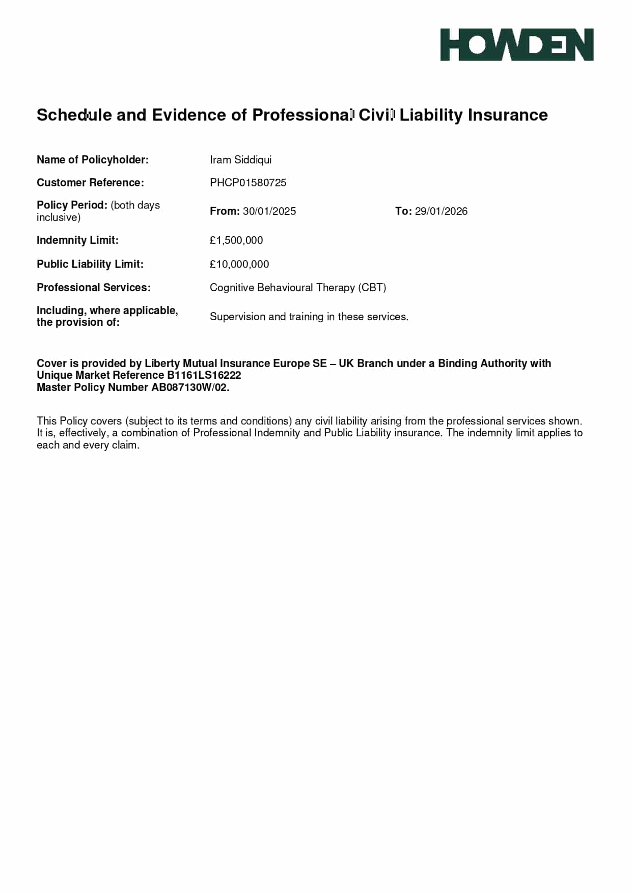 View CV View Professional InsuranceIram Siddiqui is a Cognitive Behavioural Therapist based at Bank and Harley St. Iram is accredited by the British Association for Behavioural and Cognitive Psychotherapies (BABCP). She mostly uses Cognitive Behavioural Therapy (CBT) but she also uses other approaches such as Compassion Focused Therapy (CFT) and Acceptance Commitment Therapy (ACT) and Eye Movement Desensitisation reprocessing (EMDR).